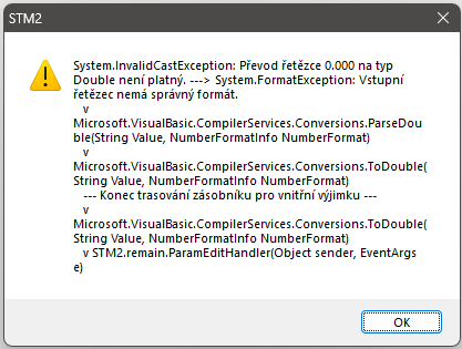 U některých instalací Windows 10 a 11 se může vyskytnout problém při zadávání parametrů materiálů, kdy software hlásí chybu v převodu řetězce. Chybové okno je potřeba zavřít stiskem OK a nemá vliv na funkci softwaru.